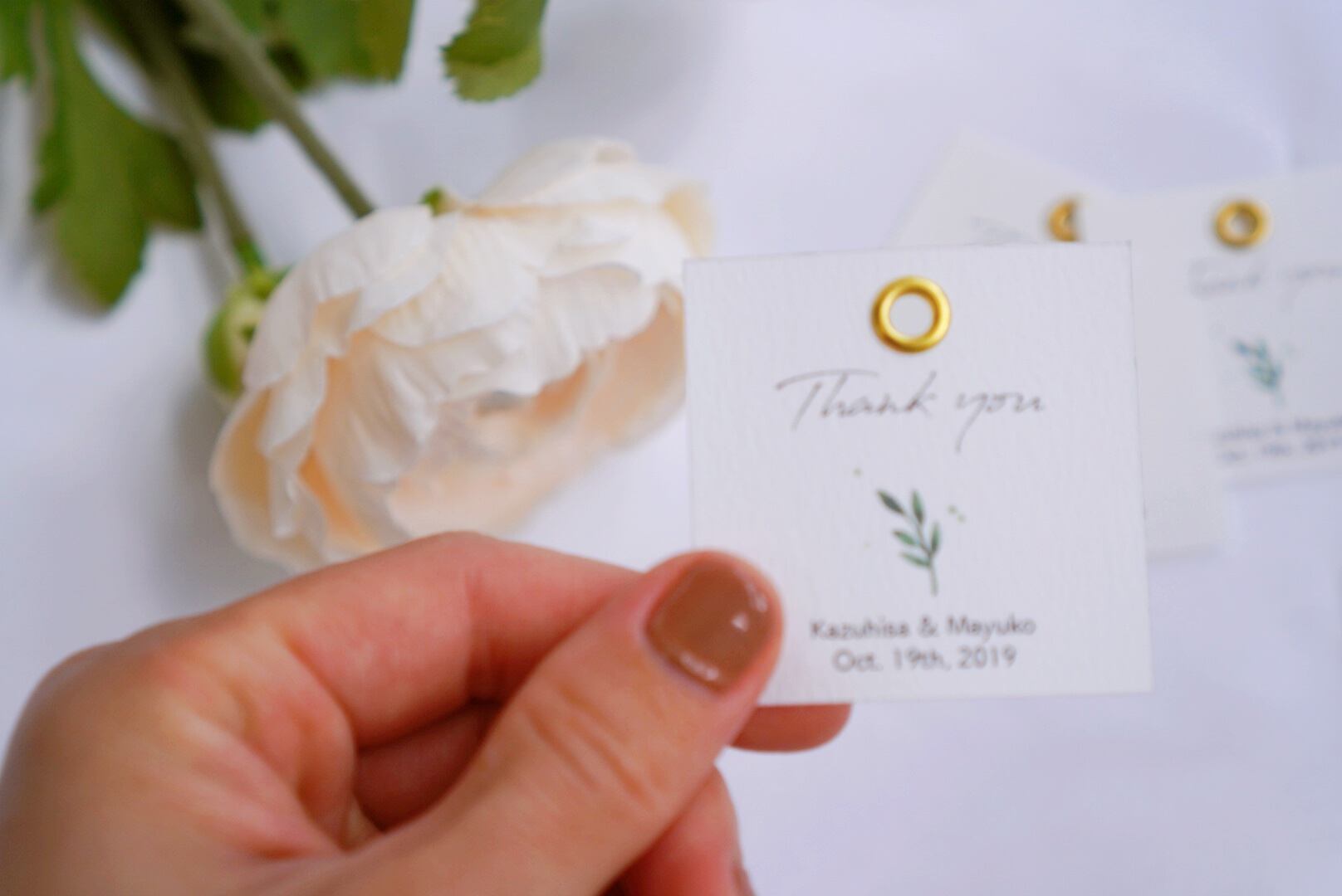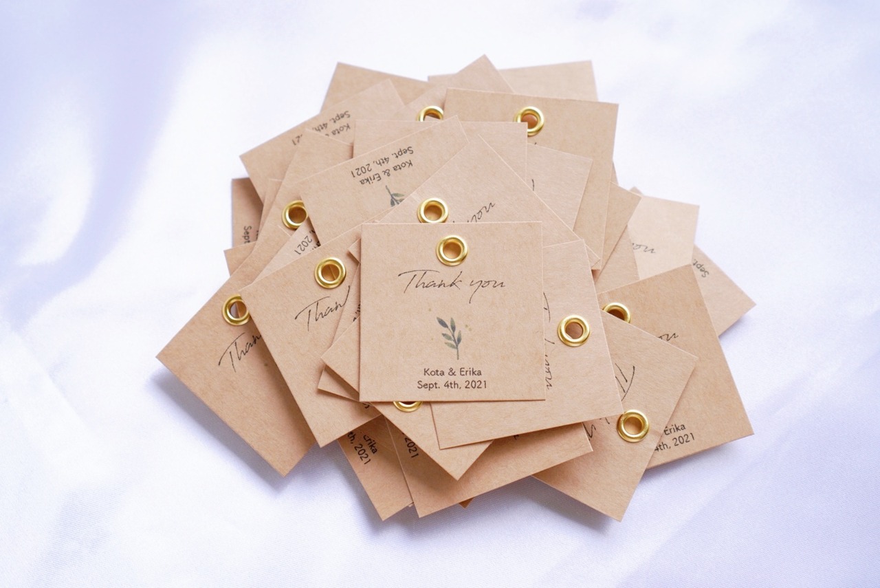 結婚式のプチギフトなどで使えるサンキュータグを制作いたします。セミオーダーですのでお名前や挙式日がお入れできます。