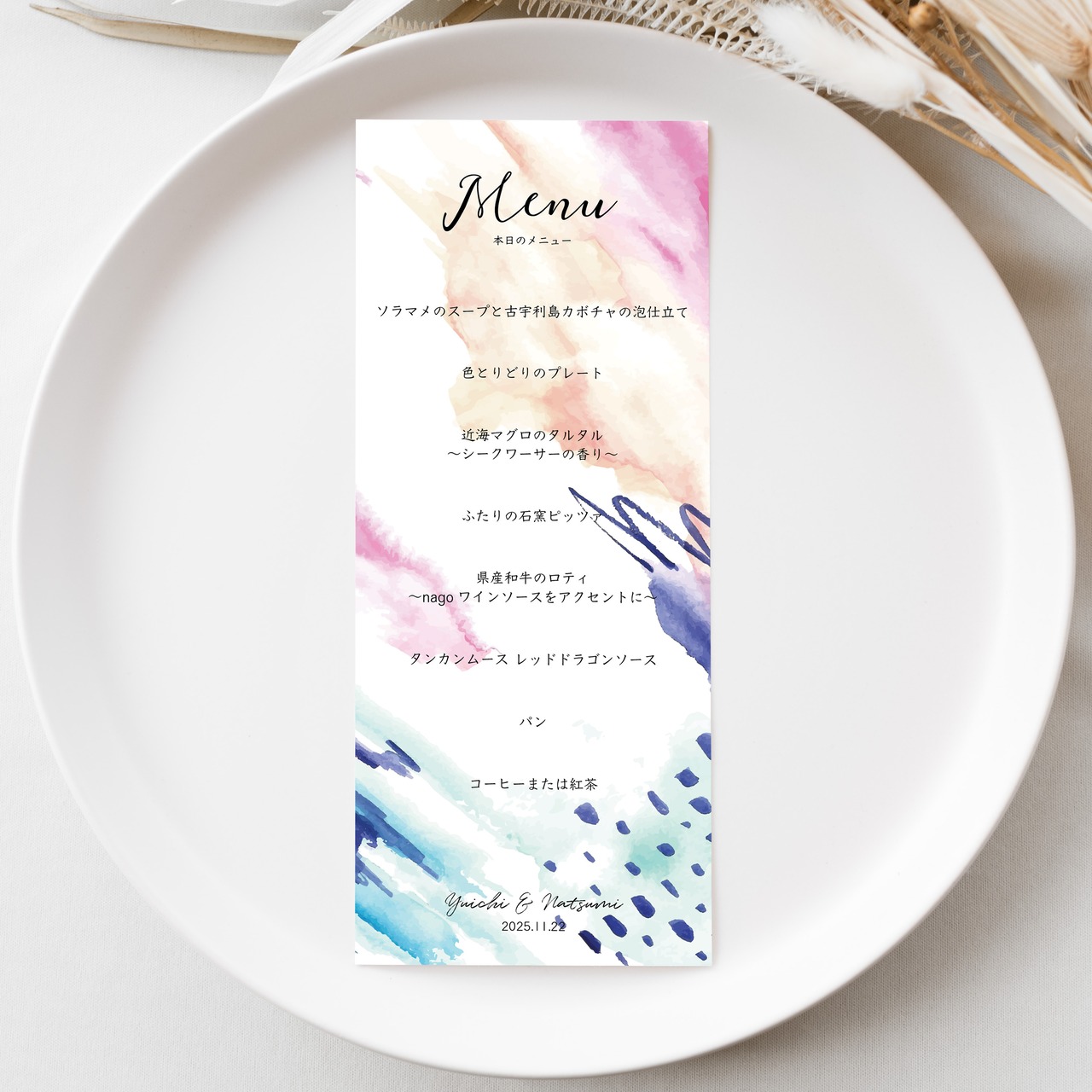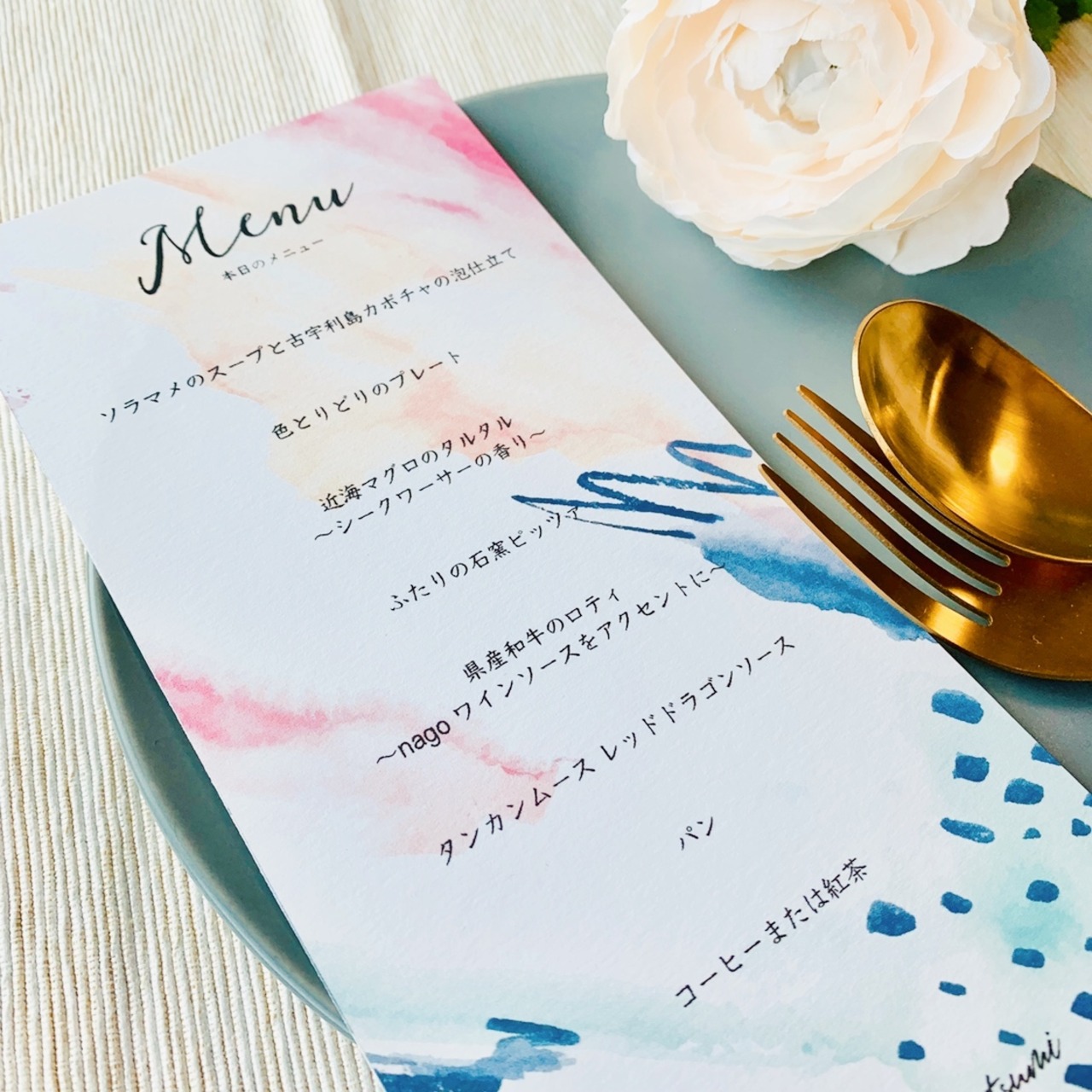 ・メニュー表: お料理リスト(改行のタイミングがわかるようにご記載ください)