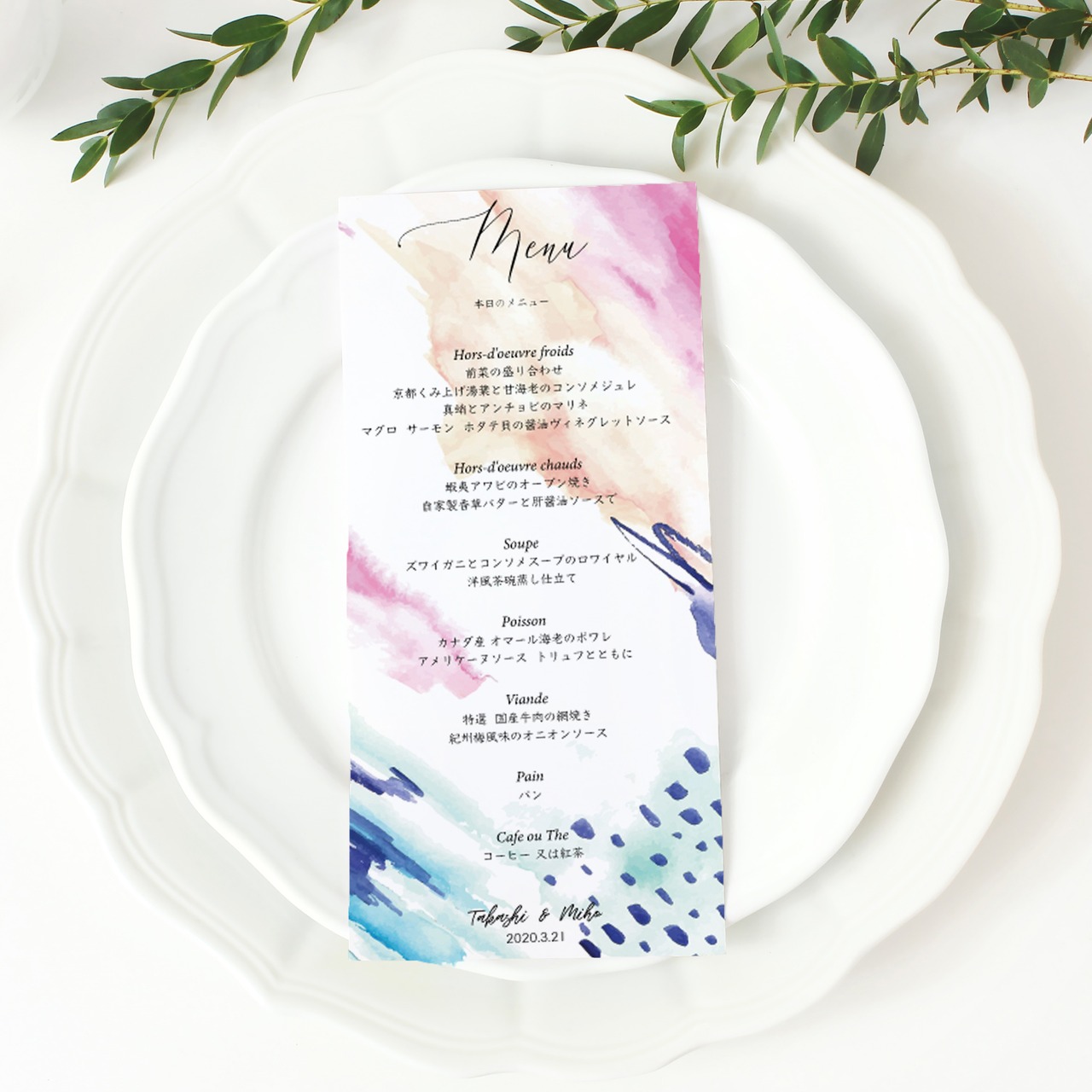 当日のお料理名、下部にお2人のお名前(ローマ字)と挙式日が入ります。サイズ違いでフードとドリンクメニューを分けることもできますし、大きい方のサイズでフード、ドリンク両方を載せることもできます。
