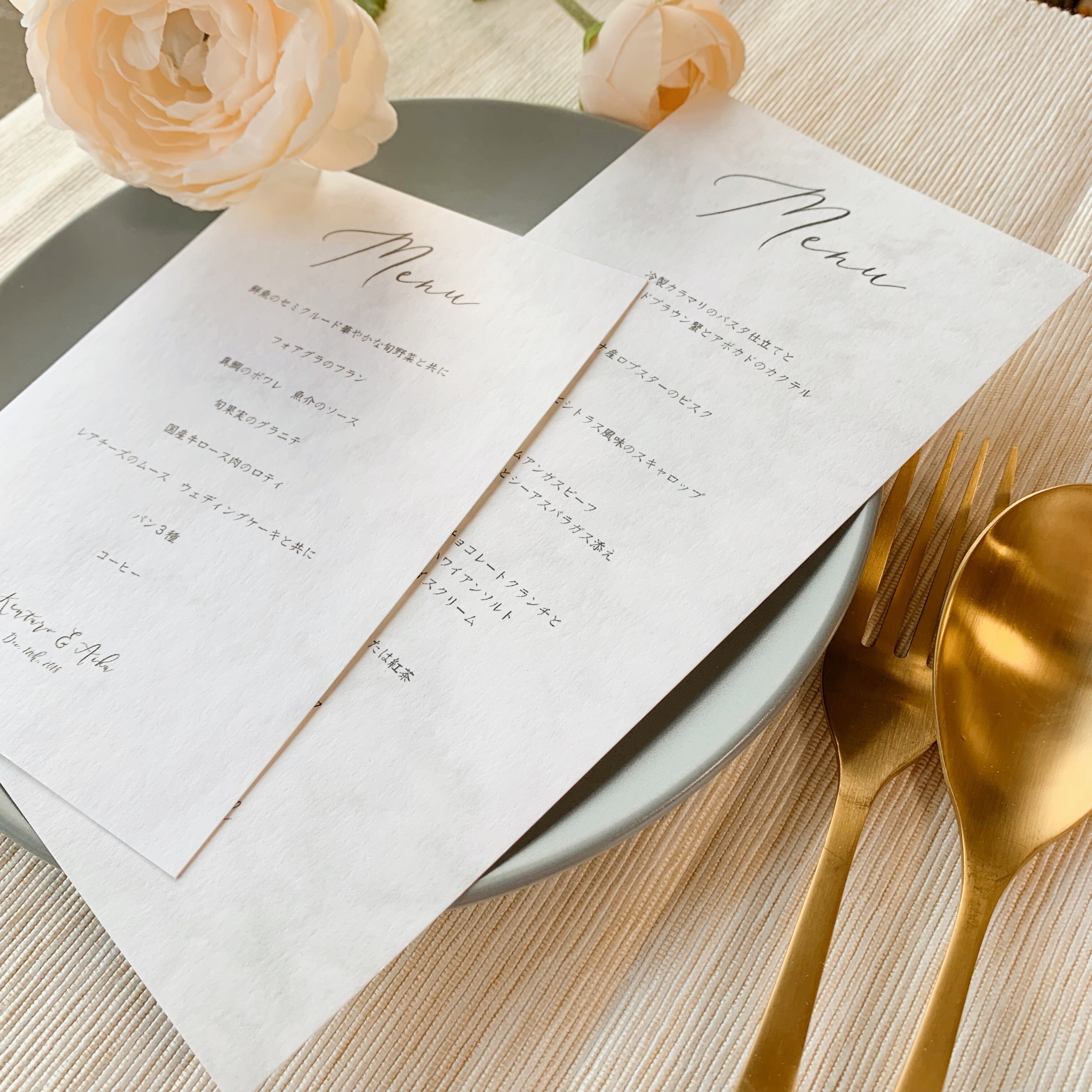 しっかりした厚みで高級感があるマーブル状のマットな用紙です。一品あたりのタイトルが長くなる方や、7品目以上の方におススメです。
