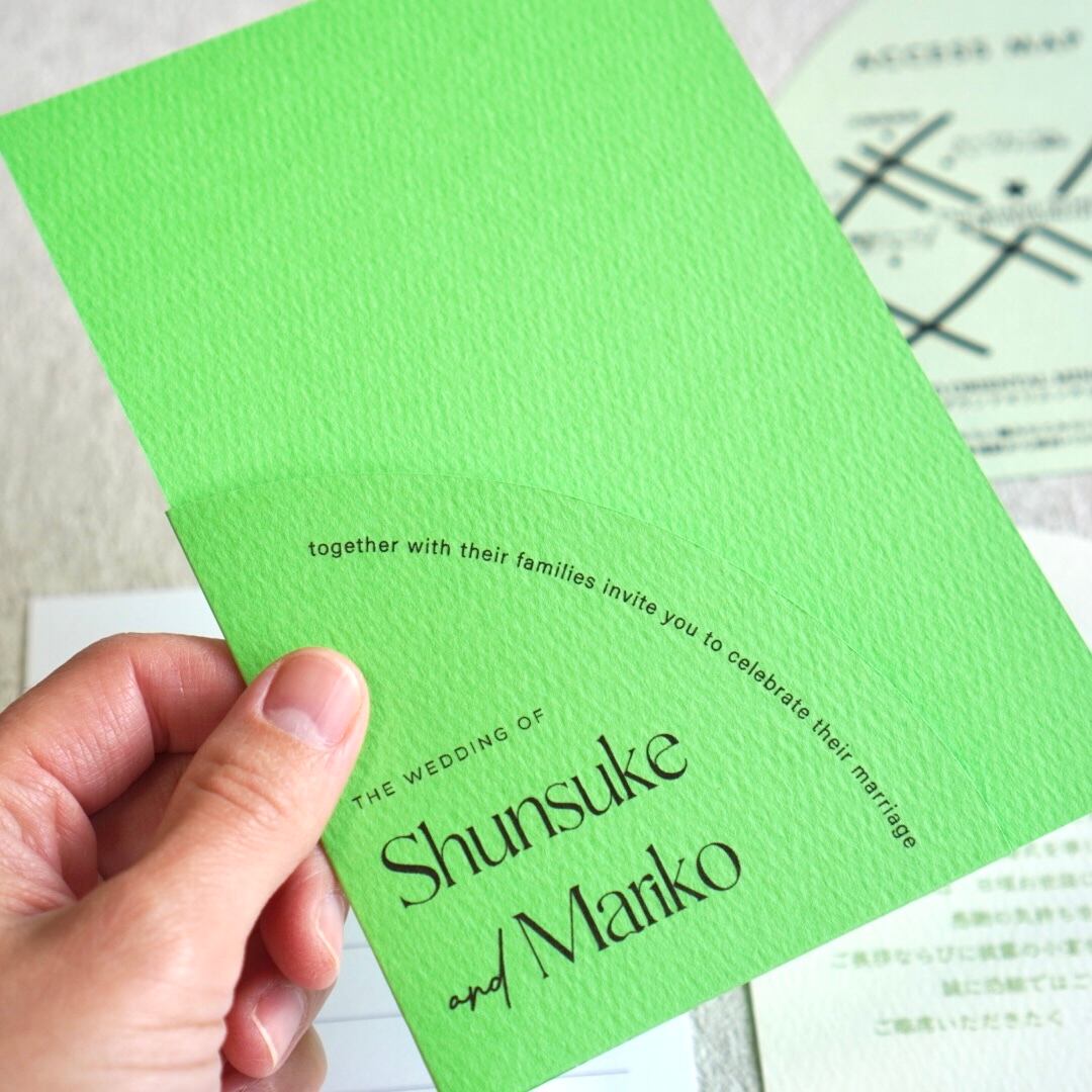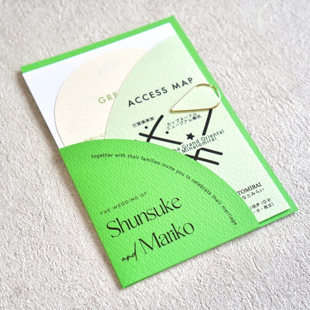 本状の文字色もポケットホルダーに合わせたグリーンとピンクでの印刷となります。